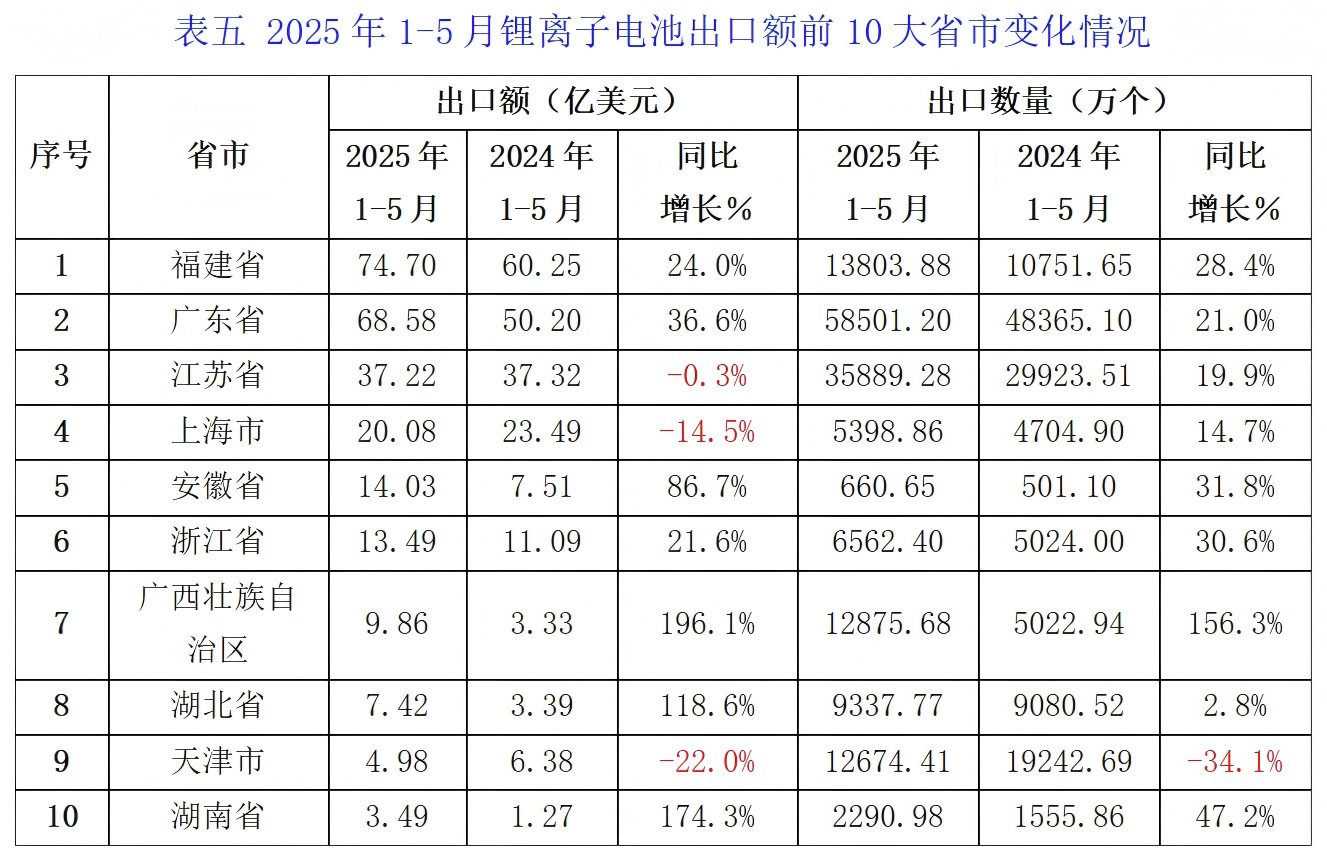 2025年1-5月福建省仍是我國鋰離子電池出口產(chǎn)品的最大來源地,出口金額為74.7億美元,同比增長24%,占我國鋰離子電池出口額的27.2%;出口數(shù)量為1.38億個,同比增長28.4%。廣東省位居第二,出口金額為68.58億美元,同比增加36.6%,占我國鋰離子電池出口額的24.9%;出口數(shù)量5.85億個,同比增長21.0%。江蘇省排名第三,出口額為37.22億美元,同比降低0.3%,占我國鋰離子電池出口額的13.5%;出口數(shù)量3.59億個,同比增長19.9%。福建、廣東和江蘇三省的鋰離子電池出口額占到全國鋰離子電池出口額的65.6%。