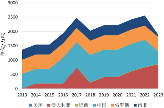 根據美國地質調查局不完全統計,截至2023年底,全球釩儲量超過6300萬噸(金屬量,下同),其中已認定的釩資源中符合當前采掘和生產要求的釩礦儲量約為1882萬噸,主要分布于澳大利亞、俄羅斯、中國和南非四國。