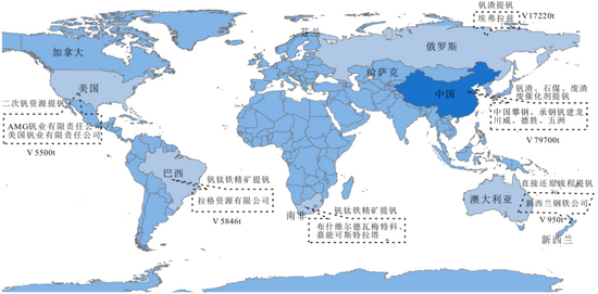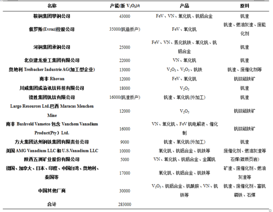 從釩資源生產商來看,全球釩資源生產商主要集中在中國。國外大約有20余家釩制品生產企業(yè),除利用釩鈦磁鐵礦為原料生產的企業(yè)外,其余都是利用廢催化劑、石油殘渣等含釩廢物為原料,或者利用氧化釩深加工生產釩鐵、釩電解液、催化劑及其他釩功能材料等。