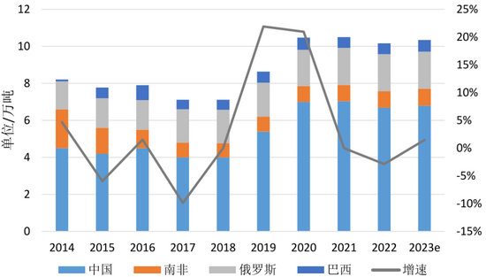 近年來,全球釩資源供給整體呈現波動上漲的趨勢。2014-2023年,全球釩資源產量同比增長均在2.8%左右,其中2019年同比增速達21.9%;2021-2022年,全球釩產量受中國粗鋼產能政策限制及結構調整等因素影響略有下滑。