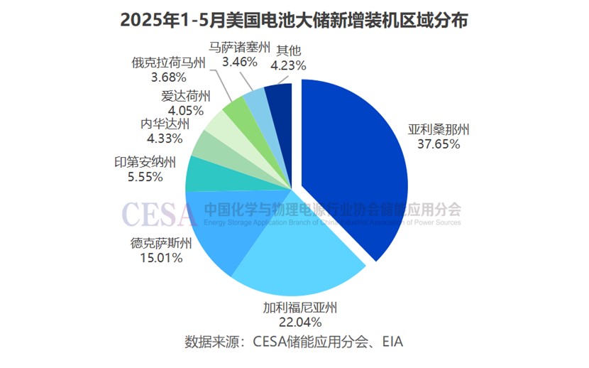 2025年1-5月,亞利桑那、加利福尼亞、德克薩斯和印第安納等州新增裝機(jī)均超過(guò)1GWh。其中,亞利桑那州新增裝機(jī)領(lǐng)跑全美,達(dá)1.74GW/6.96GWh,占比37.65%(功率)/46.15%(容量)。加利福尼亞州新增裝機(jī)1.02GW/2.84GWh,排在第二,占美國(guó)電池大儲(chǔ)新增裝機(jī)的22.04%(功率)/18.80%(容量)。
