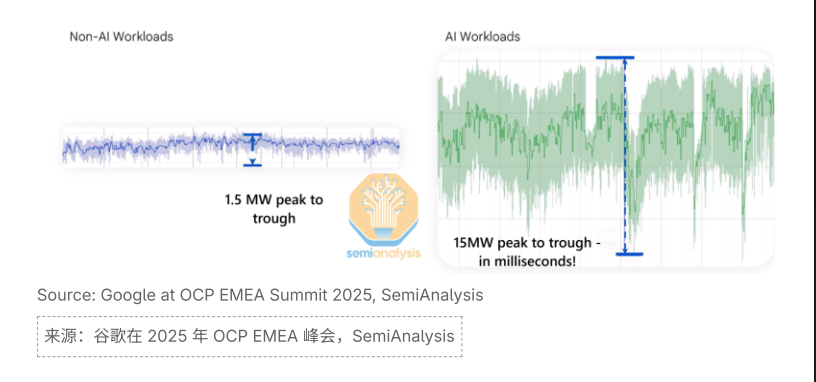 例如,Meta的LLaMA 3 訓(xùn)練集群(2.4 萬(wàn)塊 H100,30MW 容量)在檢查點(diǎn)操作時(shí),負(fù)載可驟降至近乎零,這種波動(dòng)遠(yuǎn)超傳統(tǒng)云數(shù)據(jù)中心 1.5MW 的波動(dòng)范圍,達(dá)到 15MW 級(jí)別