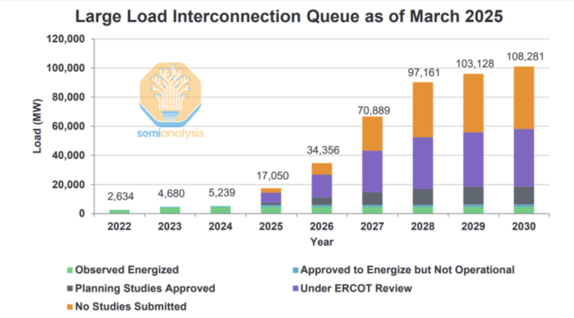 ii)與此同時(shí),美國(guó)數(shù)據(jù)中心負(fù)載已成為ERCOT(德州電網(wǎng))關(guān)注焦點(diǎn),當(dāng)前申請(qǐng)接入電網(wǎng)的負(fù)荷超過108GW,其中大部分為AI數(shù)據(jù)中心;