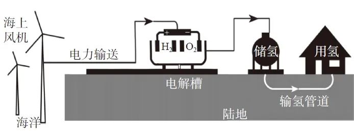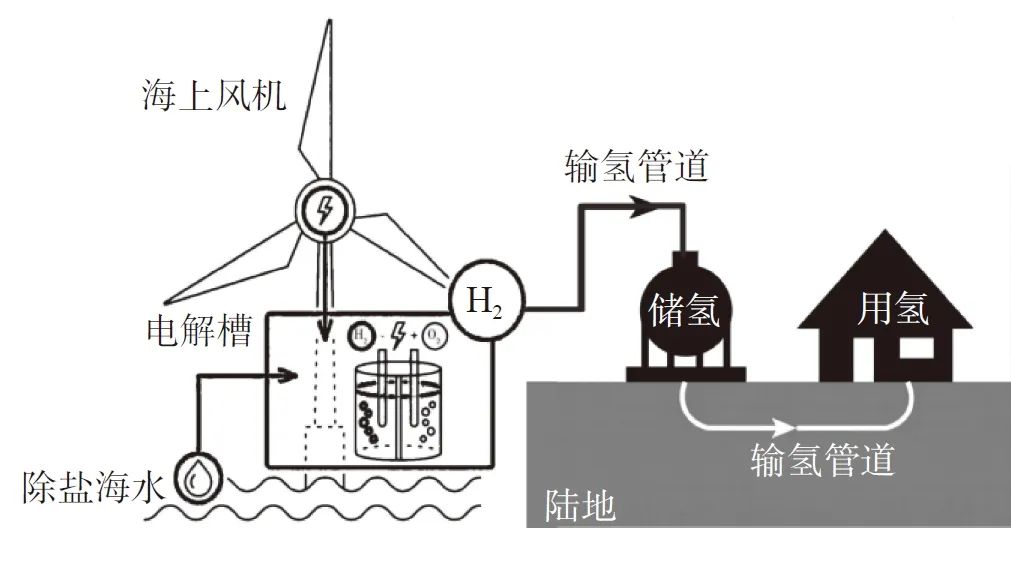 目前,海上風(fēng)電制氫主要有海上和陸上電解水制氫兩種系統(tǒng)配置。其中,海上系統(tǒng)配置由海上風(fēng)電場(chǎng)、海上電解槽和陸上儲(chǔ)用氫設(shè)施組成,可細(xì)分為海上集中式電解水制氫及分布式電解水制氫兩種方式。集中式電解水制氫是將風(fēng)力渦輪機(jī)組產(chǎn)生的電力匯集到海上平臺(tái)進(jìn)行電解水制氫,氫氣經(jīng)船舶或輸氫管道傳輸至岸上。此種制氫系統(tǒng)能利用現(xiàn)有海上油氣平臺(tái)和管道且不受水深限制,具備項(xiàng)目總體投資成本低、無(wú)需建設(shè)海上升壓站等優(yōu)勢(shì),適合發(fā)展深遠(yuǎn)海大規(guī)模風(fēng)電制氫。目前已在荷蘭NortH2、瑞典HT1等多個(gè)海外項(xiàng)目中實(shí)現(xiàn)規(guī)劃應(yīng)用,是未來(lái)我國(guó)海上制氫產(chǎn)業(yè)發(fā)展的重要方向。海上分布式電解水制氫則在每臺(tái)風(fēng)電機(jī)組塔底平臺(tái)上都安裝模塊化的制氫設(shè)備,在風(fēng)電機(jī)組側(cè)制氫并將氫氣匯集后再通過(guò)主管道壓縮傳輸至岸上,具備電力運(yùn)輸成本低、損耗低等特點(diǎn),目前在英國(guó)、德國(guó)均有相關(guān)應(yīng)用。但由于風(fēng)機(jī)平臺(tái)空間狹小,對(duì)海底管道依賴性強(qiáng),受海上氣候復(fù)雜多變因素影響故障率相對(duì)更高,其維護(hù)成本過(guò)高,目前仍存在較大優(yōu)化空間。