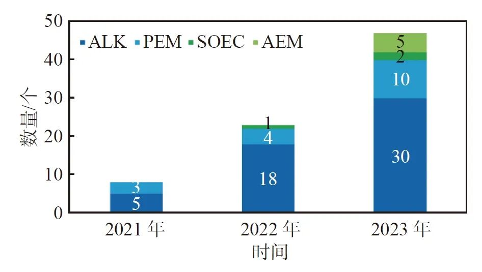 ↑ 2021-2023年我國(guó)電解槽不同技術(shù)路線產(chǎn)品下線數(shù)量