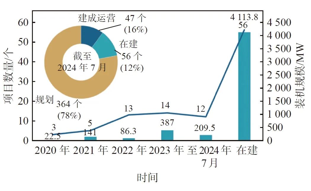 ↑ 2020-2024年我國(guó)綠氫項(xiàng)目數(shù)量與規(guī)模