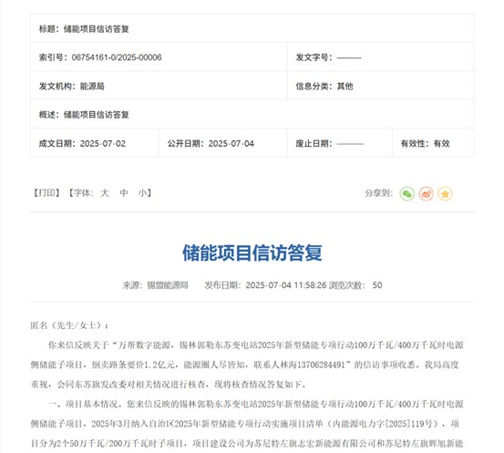 2025年3月,內(nèi)蒙古能源局發(fā)布新型儲(chǔ)能專項(xiàng)行動(dòng)項(xiàng)目清單,萬(wàn)幫數(shù)字能源旗下兩家全資子公司承建的東蘇變電站儲(chǔ)能項(xiàng)目成功入選。該項(xiàng)目包含兩個(gè)50萬(wàn)千瓦/200萬(wàn)千瓦時(shí)子工程,原定7月15日啟動(dòng)建設(shè),卻因匿名舉報(bào)陷入“倒賣路條”爭(zhēng)議,舉報(bào)方稱存在1.2億元索價(jià)行為。