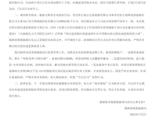 針對(duì)輿情,錫林郭勒盟能源局立即組建聯(lián)合調(diào)查組,會(huì)同東蘇旗發(fā)改委開(kāi)展專項(xiàng)核查。經(jīng)核實(shí),蘇尼特左旗志宏、輝旭兩家新能源企業(yè)確為江蘇萬(wàn)幫儲(chǔ)能科技全資控股,項(xiàng)目備案主體與前期手續(xù)辦理方完全一致,未發(fā)現(xiàn)股權(quán)變更或投資主體替換情況。項(xiàng)目已通過(guò)自治區(qū)儲(chǔ)能專項(xiàng)行動(dòng)審核,備案階段對(duì)企業(yè)資質(zhì)實(shí)施穿透式審查,有效防范“皮包公司”套取政策紅利。