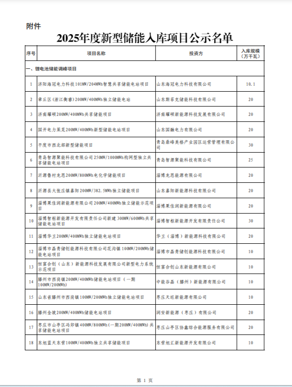總規(guī)模超42GWh!山東能源局印發(fā)《關(guān)于2025年度新型儲能入庫項目的公示》