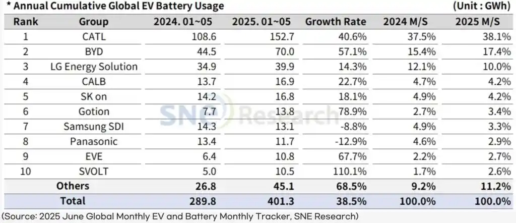 中國儲能網(wǎng)訊:寧德時代(300750.SZ/03750.HK)、比亞迪(002594.SZ/01211.HK)等中國動力電池企業(yè)在全球市場的市占率還在進一步刷新高度。韓國市場調研機構SNE Research最新發(fā)布的統(tǒng)計顯示,2025年1-5月,全球電動汽車電池裝車量約為401.3GWh,和上年同期相比(同比)增長38.5%。在裝車量前十大榜單中,寧德時代、比亞迪、中創(chuàng)新航(03931.HK)、國軒高科(002074.SZ)、億緯鋰能(300014.SZ)、蜂巢能源六家中企在全球的市場占有率合計為68.4%,同比增加了4.2個百分點。