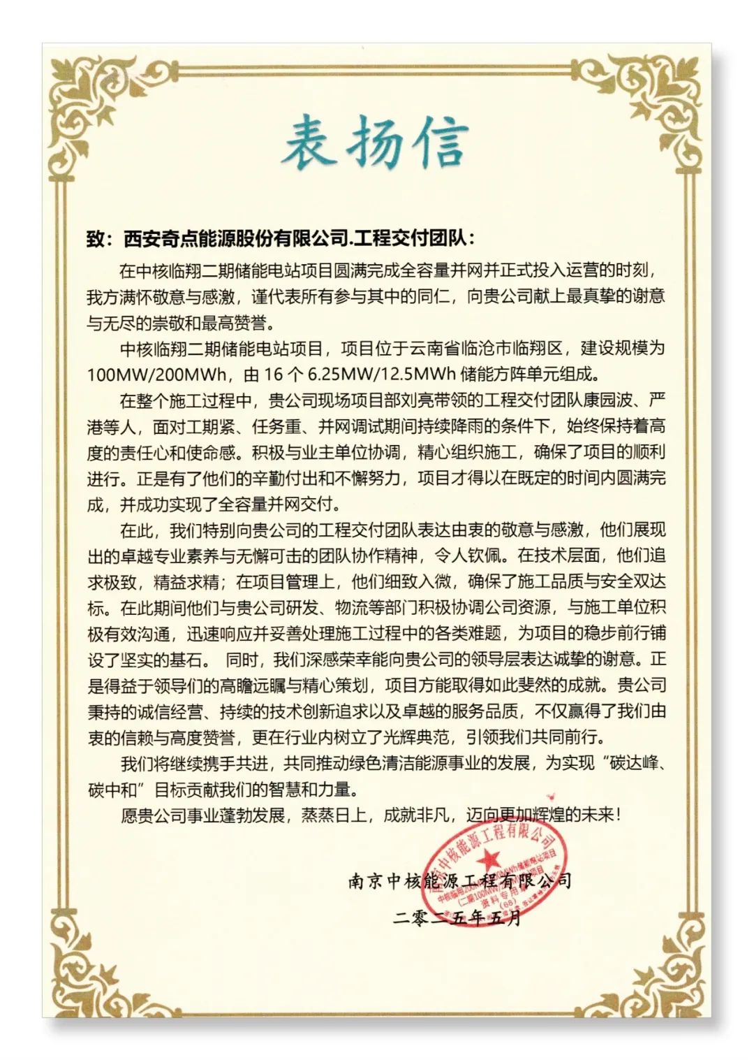 項目并網(wǎng)后,客戶特別致以感謝信,字字句句皆是肯定:”面對工期緊、任務重、并網(wǎng)調(diào)試期間持續(xù)降雨的條件下,始終保持著高度的責任心和使命感。積極與業(yè)主單位協(xié)調(diào),精心組織施工,確保了項目的順利進行。”這封表揚信,既是榮譽勛章,更是鞭策奇點能源不斷前行的動力。