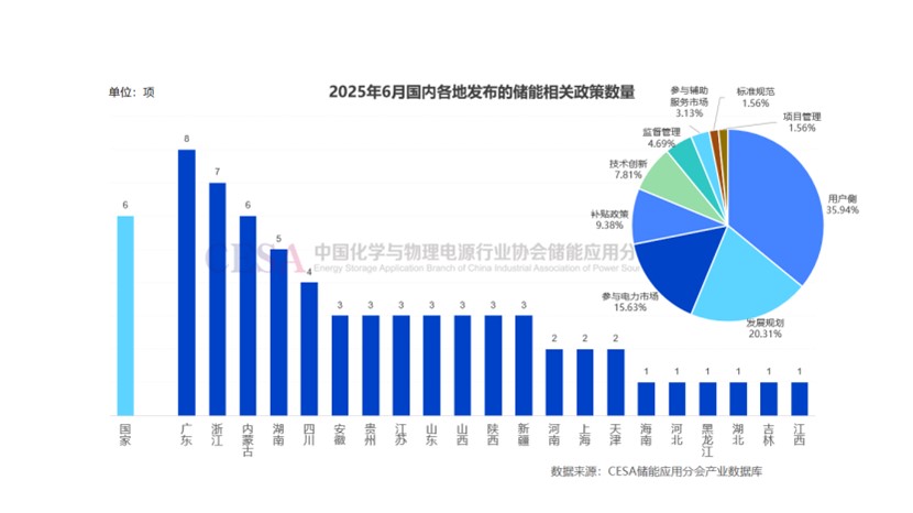 中國(guó)儲(chǔ)能網(wǎng)訊:據(jù)CESA儲(chǔ)能應(yīng)用分會(huì)產(chǎn)業(yè)數(shù)據(jù)庫(kù)不完全統(tǒng)計(jì),2025年6月份共發(fā)布儲(chǔ)能相關(guān)政策69項(xiàng),其中國(guó)家層面發(fā)布6項(xiàng),發(fā)展規(guī)劃、監(jiān)督管理類(lèi)政策各有2項(xiàng),標(biāo)準(zhǔn)規(guī)范、新能源配儲(chǔ)類(lèi)政策各有1項(xiàng)。