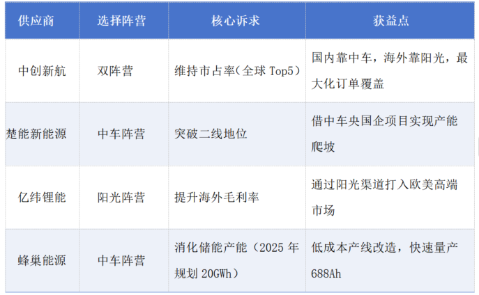 當然,在這場非此即彼的站隊中,總有一些玩家展現出更高明的生存智慧。中創(chuàng)新航和欣旺達,便是其中的佼佼者。它們選擇了“雙面押注”的騎墻策略,同時響應兩大標準,以求在不確定的未來中,實現風險對沖與利益最大化,也成為了這場對決中最值得關注的變量。