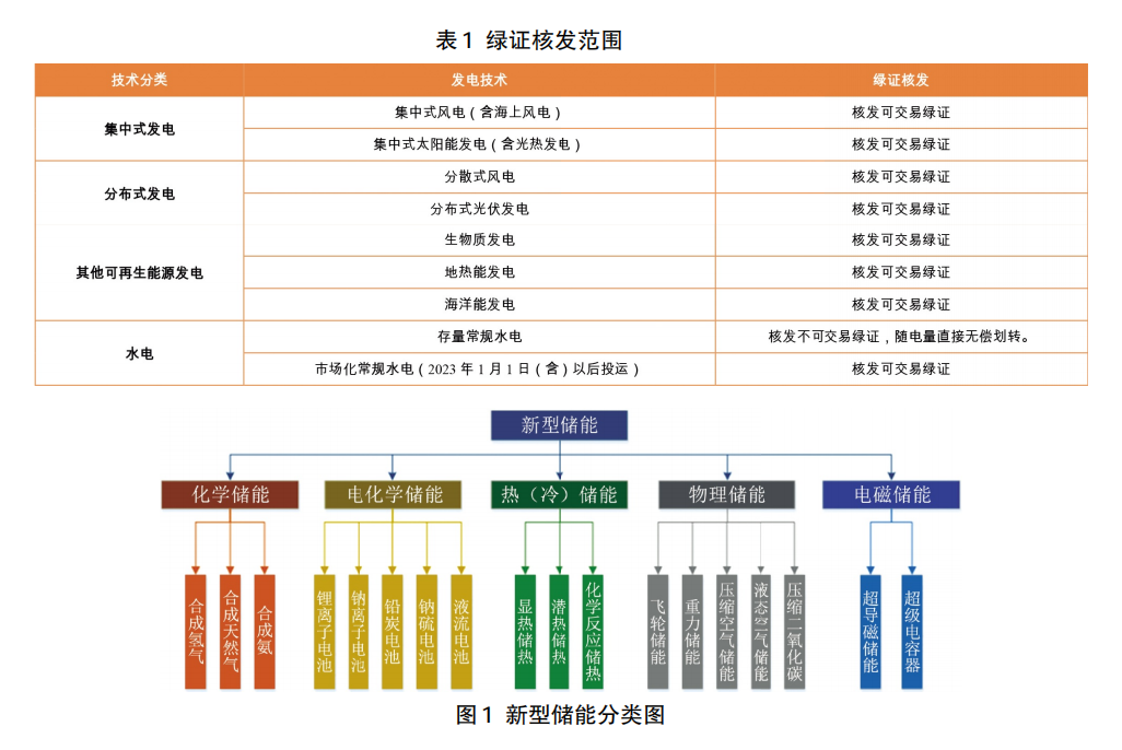 中國(guó)儲(chǔ)能網(wǎng)訊:綠證作為可再生能源電力消費(fèi)憑證,用于可再生能源電力消費(fèi)量核算、可再生能源電力消費(fèi)認(rèn)證等,1個(gè)綠證對(duì)應(yīng)1000千瓦時(shí)可再生能源電量。國(guó)家發(fā)展改革委、財(cái)政部、國(guó)家能源局《關(guān)于做好可再生能源綠色電力證書(shū)全覆蓋工作 促進(jìn)可再生能源電力消費(fèi)的通知》(發(fā)改能源〔2023〕1044號(hào))明確,綠證是我國(guó)可再生能源電量環(huán)境屬性的唯一證明,是認(rèn)定可再生能源電力生產(chǎn)、消費(fèi)的唯一憑證。并規(guī)定如表1對(duì)全國(guó)風(fēng)電(含分散式風(fēng)電和海上風(fēng)電)、太陽(yáng)能發(fā)電(含分布式光伏發(fā)電和光熱發(fā)電)、常規(guī)水電、生物質(zhì)發(fā)電、地?zé)崮馨l(fā)電、海洋能發(fā)電等已建檔立卡的可再生能源發(fā)電項(xiàng)目所生產(chǎn)的全部電量核發(fā)綠證,實(shí)現(xiàn)綠證核發(fā)全覆蓋,但并未對(duì)儲(chǔ)存新能源的儲(chǔ)能設(shè)施核發(fā)綠證作出具體規(guī)定說(shuō)明。