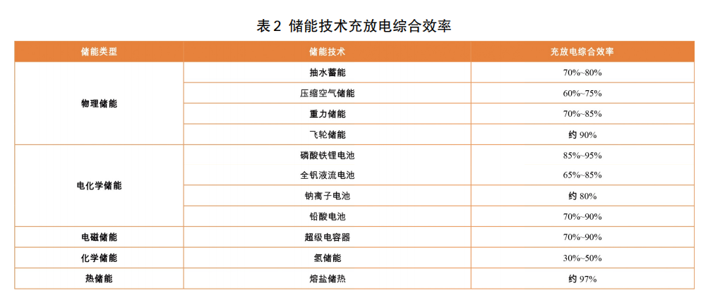 不同儲(chǔ)能技術(shù)的技術(shù)路線不同,充放電綜合效率也不相同,充放電綜合效率為考慮損耗后放電量和充電量的比值,反映儲(chǔ)能技術(shù)存儲(chǔ)能源的效率,表2給出了典型儲(chǔ)能技術(shù)的充放電綜合效率。從表2可以看出,不同儲(chǔ)能技術(shù)的充放電綜合效率差異較大,在30%到97%之間。