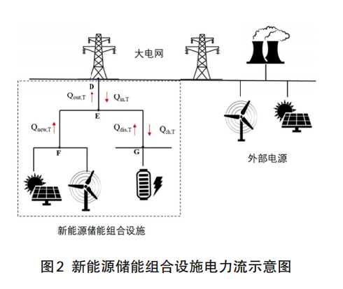 在圖2中節(jié)點(diǎn)E考慮T周期內(nèi)電量平衡,即流入和流出節(jié)點(diǎn)E的電量相等,Qnew,T+Qin,T+Qdis,T=Qout,T+Qch,T??紤]T周期內(nèi)儲(chǔ)能設(shè)施儲(chǔ)存的能量回到初始狀態(tài),即T周期內(nèi)儲(chǔ)能設(shè)施充入的電量全部放出,t=T時(shí)刻存儲(chǔ)的能量等于t=0時(shí)刻存儲(chǔ)的能量??紤]儲(chǔ)能損耗,有Qdis,T=Qch,T·η。