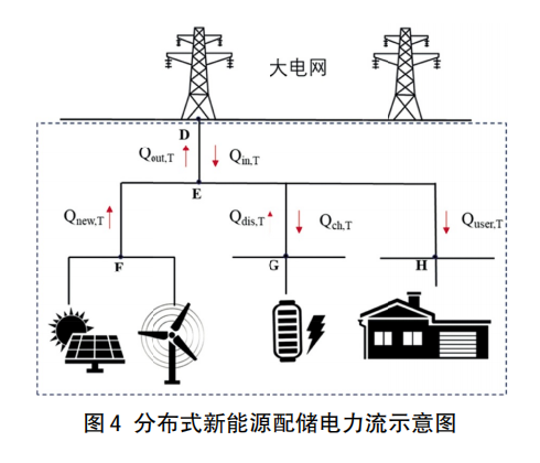 考慮儲(chǔ)能損耗的精確計(jì)量,在圖4中考慮周期T時(shí)間內(nèi)節(jié)點(diǎn)E的電量平衡,即Qnew,T+Qin,T+Qdis,T=Qout,T+Qch,T+Quser,T,這時(shí),新能源發(fā)電量可以用于用戶(hù)用電、儲(chǔ)能充電和上網(wǎng),下網(wǎng)電量可以用于用戶(hù)用電和儲(chǔ)能充電,在電量層面用戶(hù)用電量中難以區(qū)分由新能源發(fā)電量提供的部分和下網(wǎng)電量提供的部分,上網(wǎng)電量中也難以區(qū)分新能源發(fā)電提供的上網(wǎng)部分和下網(wǎng)電量經(jīng)過(guò)儲(chǔ)能重新上網(wǎng)的部分。