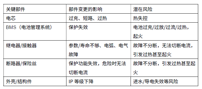 ? 關(guān)鍵部件,如未登記的供應(yīng)商、不同的電流/電壓/溫度/循環(huán)壽命等參數(shù);