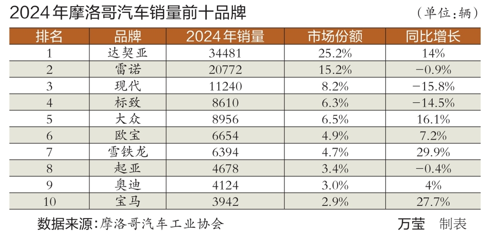 “近年來,中國汽車特別是新能源汽車產(chǎn)業(yè)鏈企業(yè)在摩洛哥越來越多,尤其是動(dòng)力電池及材料企業(yè)。”尤素福表示,摩洛哥新能源汽車市場出現(xiàn)了多個(gè)中國品牌的身影。比亞迪2023年在摩洛哥推出3款車型,2024年成為摩洛哥插混車銷量最高的品牌。今年,吉利、極氪等中國品牌的新能源車型也在加速進(jìn)入摩洛哥市場。