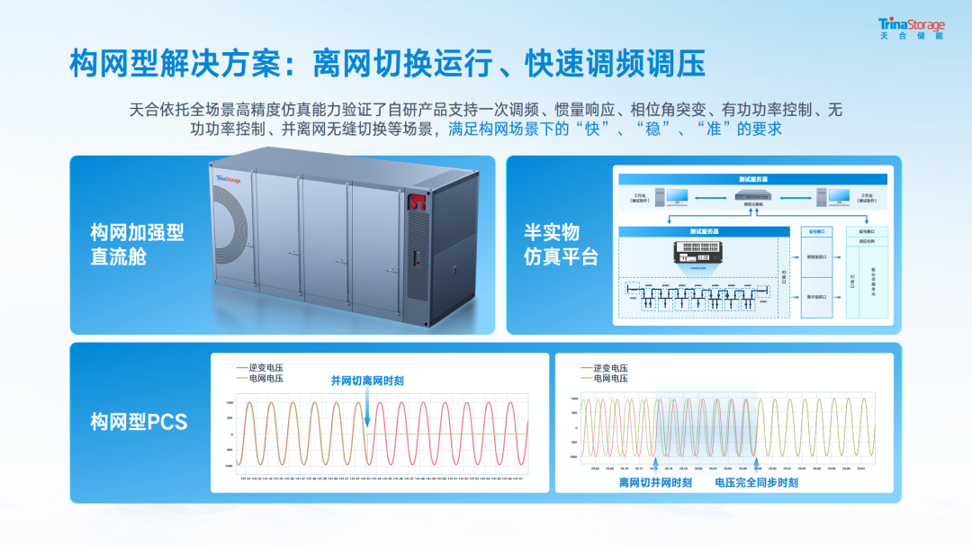 日前,天合已構(gòu)建起“大容量柔性?xún)?chǔ)能平臺(tái)+毫秒級(jí)響應(yīng)MV-Skid+大數(shù)據(jù)AI運(yùn)維云端”在內(nèi)的一體化AC側(cè)全棧能力,實(shí)現(xiàn)硬件到軟件全端口耦合運(yùn)行,保障離并網(wǎng)自主調(diào)節(jié),提高局部電網(wǎng)韌性,減少短路并發(fā)下的連鎖負(fù)反饋。2025年3月,天合于常州總部自主完成構(gòu)網(wǎng)型儲(chǔ)能實(shí)證,微網(wǎng)測(cè)試模擬Block級(jí)電站項(xiàng)目,實(shí)現(xiàn)30s系統(tǒng)黑啟動(dòng)方案。2025年7月,天合完成行業(yè)首批10MW級(jí)MV一體機(jī)產(chǎn)品落地,達(dá)成三電融合下從技術(shù)開(kāi)發(fā)到規(guī)模化商業(yè)應(yīng)用的路徑探索。