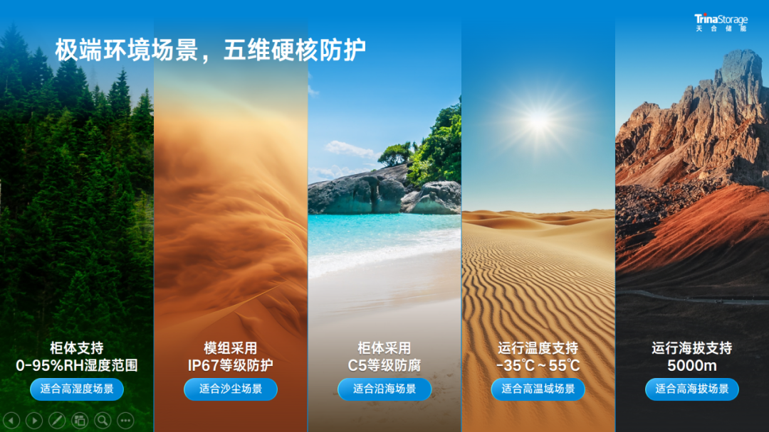 鑒于沙戈荒電站項(xiàng)目常見(jiàn)惡劣環(huán)境條件,天合儲(chǔ)能深入安全設(shè)計(jì)及場(chǎng)景應(yīng)用等維度考量,創(chuàng)新開(kāi)發(fā)極端場(chǎng)景應(yīng)用儲(chǔ)能系統(tǒng)。針對(duì)晝夜極端溫差環(huán)境,天合儲(chǔ)能電池艙集成高性能保溫材料、葉脈仿生液冷技術(shù)及智慧熱管理系統(tǒng),優(yōu)化電氣間隙與爬電距離,保障電芯間溫差≤2.5℃,護(hù)航系統(tǒng)在-35°C至55°C范圍內(nèi)的穩(wěn)定運(yùn)行,有效規(guī)避電池性能衰減及熱失控風(fēng)險(xiǎn)。針對(duì)典型風(fēng)沙及凝露反潮現(xiàn)象,Elementa儲(chǔ)能系統(tǒng)設(shè)計(jì)多道靜動(dòng)態(tài)密封性檢測(cè),配置IP55/C5級(jí)艙體防護(hù),優(yōu)化器件反擊穿和滅弧措施,解決靜電、腐蝕、水霧等安全隱患。