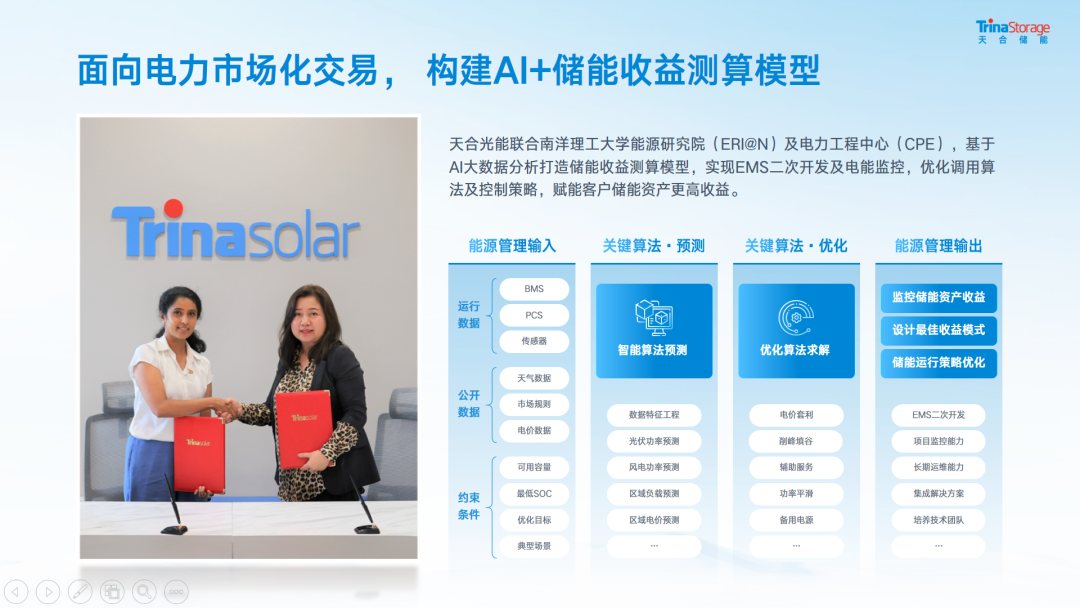 響應(yīng)電力交易市場(chǎng)化進(jìn)程,提前布局源網(wǎng)荷儲(chǔ)新場(chǎng)景運(yùn)營(yíng)能力,天合依托沙戈荒地區(qū)低度電成本優(yōu)勢(shì),通過(guò)“新能源+儲(chǔ)能”模式,推進(jìn)省間現(xiàn)貨市場(chǎng)、虛擬電廠、綠證/碳交易等多元收益可能開(kāi)發(fā)。在西北裝機(jī)高增長(zhǎng)高滲透大省合理配儲(chǔ),改善阻抗特性,抑制寬頻振蕩,構(gòu)筑電力市場(chǎng)化舒適區(qū),孵化新型電力系統(tǒng)下能源資源利用新形勢(shì),提升投資預(yù)期IRR,助力企業(yè)完成CCER等邊際收益回報(bào),賦能客戶(hù)更高儲(chǔ)能價(jià)值。