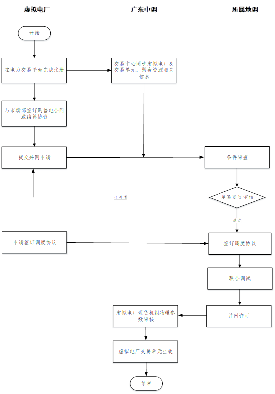 虛擬電廠并網(wǎng)流程分為:條件審查、簽訂調(diào)度協(xié)議、聯(lián)合調(diào)試、并網(wǎng)許可、并網(wǎng)運(yùn)行管理。具體如下: