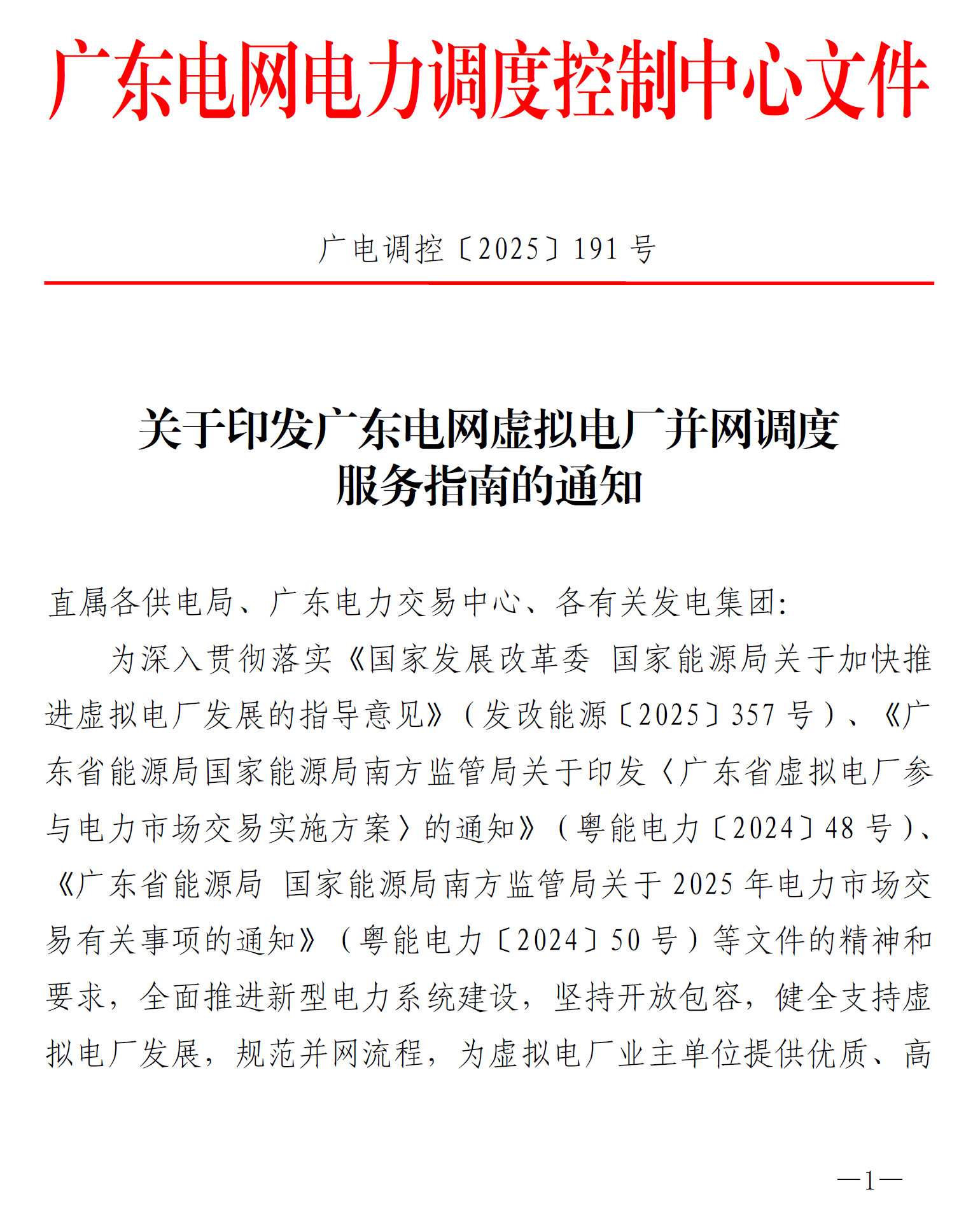 關(guān)于印發(fā)廣東電網(wǎng)虛擬電廠并網(wǎng)調(diào)度服務(wù)指南的通知