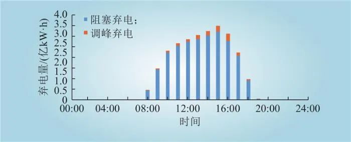 CAISO運(yùn)營區(qū)域新能源棄電呈現(xiàn)“時(shí)段不均衡”特性,日內(nèi)棄電主要集中在09:00—18:00時(shí)段。CAISO運(yùn)營區(qū)域日內(nèi)新能源棄電呈現(xiàn)“白天高、夜間低”的特征,白天光伏大發(fā)期間調(diào)峰棄電和阻塞棄電均大幅增加。今年以來,新能源日內(nèi)累計(jì)阻塞棄電量24.26億kW·h、占比94%,調(diào)峰棄電量1.66億kW·h、占比6%。今年以來CAISO運(yùn)營區(qū)域新能源日內(nèi)累計(jì)調(diào)峰棄電和阻塞棄電分析如圖4所示。
