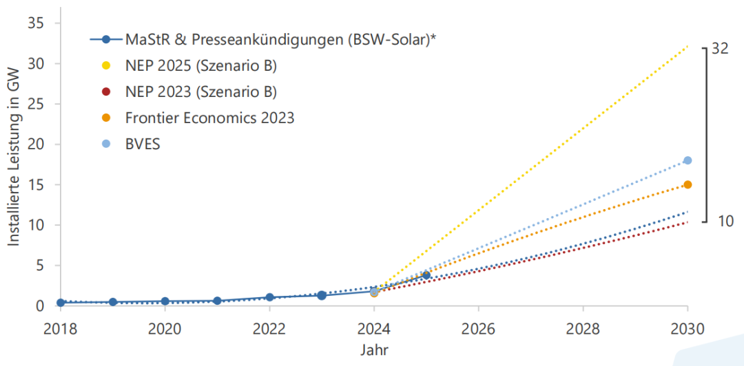 目前德國已安裝約1.9吉瓦的大型電池儲能系統(tǒng),到2030年這一數(shù)值可能達到兩位數(shù)。 自去年年底以來,關(guān)于“電池海嘯”[1]席卷德國以及電池儲能市場出現(xiàn)“淘金熱”的新聞報道層出不窮。據(jù)稱,2025年初僅輸電系統(tǒng)運營商(TSO)就收到了超過220吉瓦的并網(wǎng)申請[2]。其背景包括鋰離子電池價格下降,以及中國電池制造商因電動汽車銷量低迷而釋放出產(chǎn)能。盡管大多數(shù)新聞文章已強調(diào)只有部分申請項目會真正建成,但尖銳的報道引發(fā)了電網(wǎng)運營商、市政當(dāng)局以及如今也包括市民的擔(dān)憂。