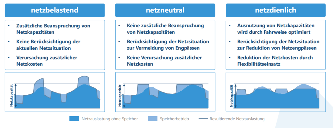 對于并網(wǎng)的、私人融資的儲能系統(tǒng),市場支持型和系統(tǒng)支持型的運行模式——即長期和非常短期的供需時間平衡——目前構(gòu)成了其大部分收入來源。然而,這兩者都屬于“銅板層面”(auf der Kupferplatte)的應(yīng)用案例,因為無論是調(diào)頻服務(wù)還是電力交易所交易都不具有區(qū)域性成分,無法考慮電網(wǎng)的當(dāng)?shù)貭顩r。然而,根據(jù)當(dāng)前的電網(wǎng)狀況和位置,這些運行模式可能對電網(wǎng)產(chǎn)生不同的影響。與此相對,存在一些明確基于當(dāng)前電網(wǎng)狀況的運行模式。為區(qū)分對電網(wǎng)的影響,下文將界定“電網(wǎng)負荷型”(netzbelastend)、“電網(wǎng)中性型”(netzneutral)和“電網(wǎng)支持型”(netzdienlich)等概念(見圖3)[16]。