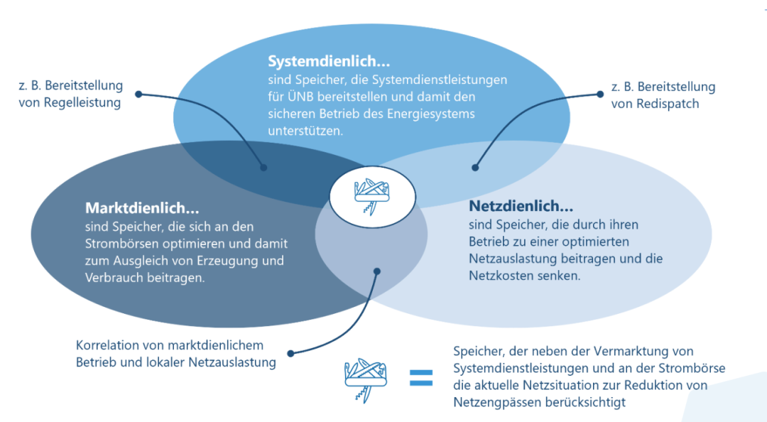 重要的是,這些定義并不與電網(wǎng)運營商的具體工具綁定,而是可以通過不同的方法實現(xiàn)電網(wǎng)中性和電網(wǎng)支持型。這些定義本身并非對儲能系統(tǒng)的普遍要求。因此,工具的設(shè)計或使用也不應(yīng)一概而論,而應(yīng)始終以當(dāng)?shù)仉娋W(wǎng)狀況(即局部和臨時的網(wǎng)絡(luò)限制)為導(dǎo)向。