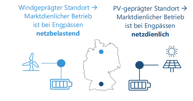 如果儲能系統(tǒng)的運行模式不基于實際的電網(wǎng)負載情況,則必須假設(shè)該儲能系統(tǒng)在某些情況下會占用額外的電網(wǎng)容量。因此,連接此類儲能系統(tǒng)通常會導(dǎo)致公共電網(wǎng)擴建的成本(投資性標(biāo)準(zhǔn)),為此需支付建設(shè)成本分攤費(BKZ)。同樣,電網(wǎng)負荷型儲能系統(tǒng)的運行方式可能導(dǎo)致(額外的)電網(wǎng)運營商干預(yù),例如依據(jù)再調(diào)度(Redispatch)或《能源經(jīng)濟法》(EnWG)第14a條(操作性標(biāo)準(zhǔn))。一個例子就是在周邊可再生能源(EE)發(fā)電設(shè)施被限電的同時,從儲能系統(tǒng)向電網(wǎng)注入電力。