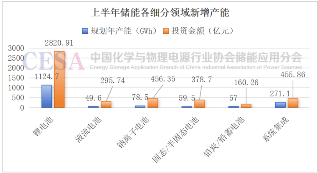 從上半年新增產(chǎn)能的規(guī)模和投資金額上,固態(tài)、半固態(tài)電池也超越了液流電池儲(chǔ)能。