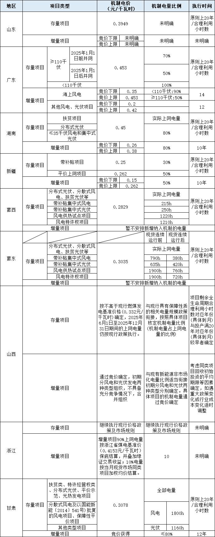 注:山東、廣東、湖南、山西、甘肅機(jī)制電量、電價政策為征求意見版本。