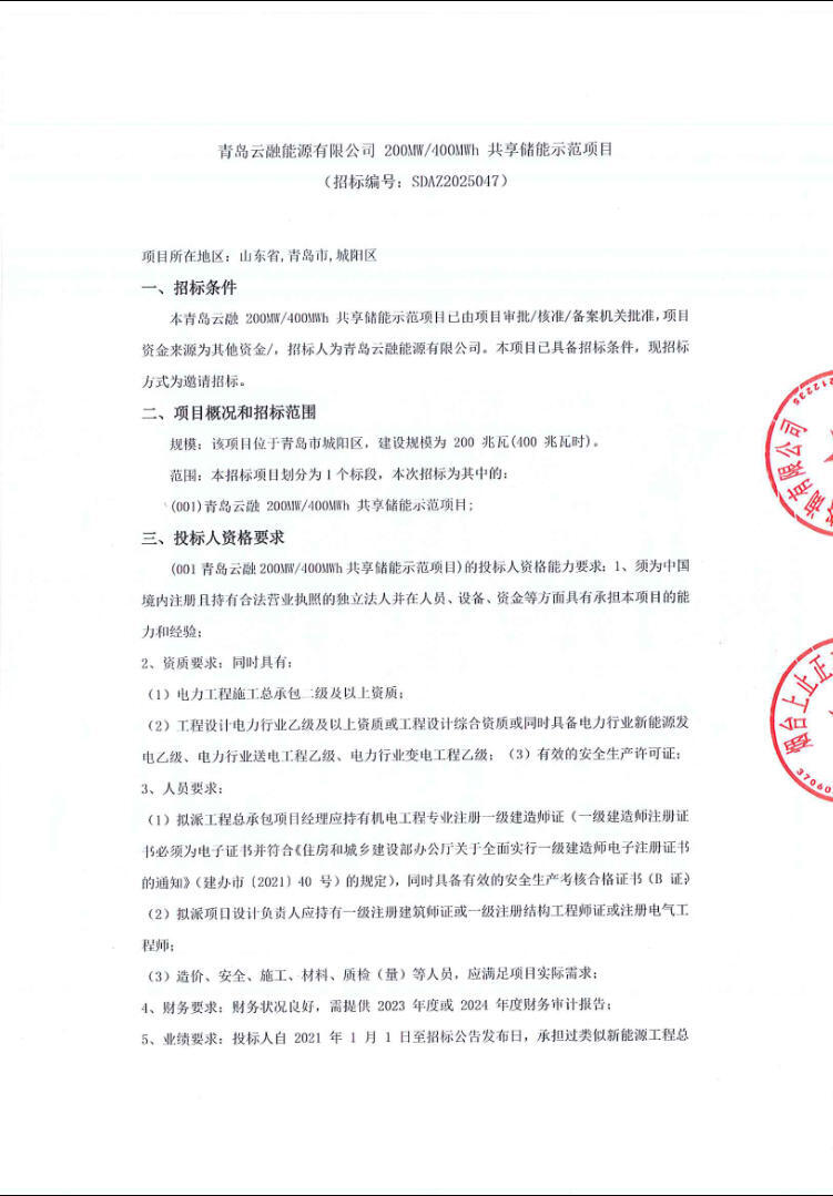 中國儲(chǔ)能網(wǎng)訊:7月26日,青島云融能源有限公司200MW/400MWh共享儲(chǔ)能示范項(xiàng)目招標(biāo)公告發(fā)布,招標(biāo)人為青島云融能源有限公司。