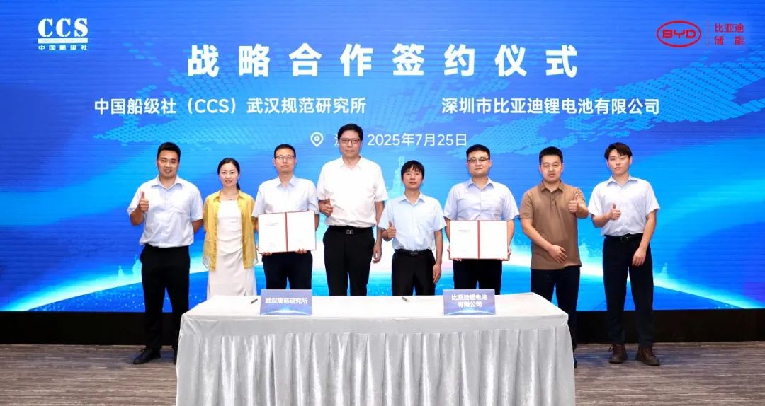 中國儲能網(wǎng)訊:2025年7月25日,比亞迪儲能與中國船級社武漢規(guī)范研究所(簡稱“CCS武漢所”)在深圳坪山舉行戰(zhàn)略合作簽約儀式。中國船級社武漢規(guī)范研究所黨委書記劉東、中國船級社武漢規(guī)范研究所副所長魏穎春、中國船級社武漢規(guī)范研究所電池船首席技術(shù)專家黃朝霞、比亞迪儲能新型應(yīng)用產(chǎn)品線總監(jiān)姜新軍、研發(fā)中心副總監(jiān)江鈺鋒、銷售總監(jiān)王宏博等出席。