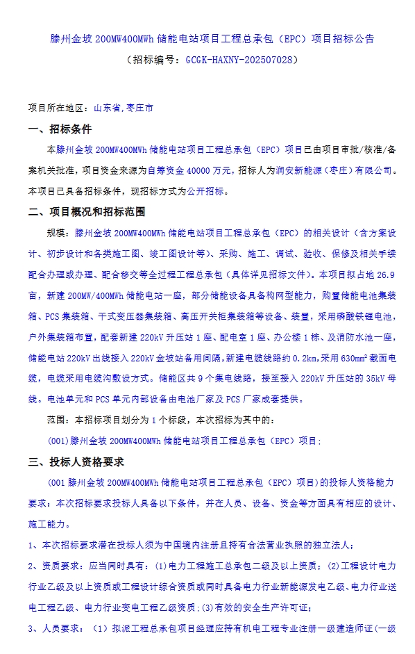 項(xiàng)目招標(biāo)范圍為滕州金坡 200MW400MWh 儲(chǔ)能電站項(xiàng)目工程總承包(EPC)的相關(guān)設(shè)計(jì)(含方案設(shè)計(jì)、初步設(shè)計(jì)和各類施工圖、竣工圖設(shè)計(jì)等)、采購(gòu)、施工、調(diào)試、驗(yàn)收、保修及相關(guān)手續(xù)配合辦理或辦理、配合移交等全過程工程總承包(具體詳見招標(biāo)文件)。本項(xiàng)目擬占地 26.9畝,新建 200MW/400MWh 儲(chǔ)能電站一座,部分儲(chǔ)能設(shè)備具備構(gòu)網(wǎng)型能力,購(gòu)置儲(chǔ)能電池集裝箱、PCS 集裝箱、干式變壓器集裝箱、高壓開關(guān)柜集裝箱等設(shè)備、裝置,采用磷酸鐵鋰電池,戶外集裝箱布置,配套新建 220ky 升壓站1座、配電室1座、辦公樓1棟、及消防水池一座,儲(chǔ)能電站 220kV 出線接入220kV金坡站備用間隔,新建電纜線路約0.2km,采用 630mm 截面電纜,電纜采用電纜溝敷設(shè)方式。儲(chǔ)能區(qū)共9個(gè)集電線路,接至接入220kV升壓站的 35kV母電池單元和 PCS 單元內(nèi)部設(shè)備由電池廠家及 PCS 廠家成套提供。