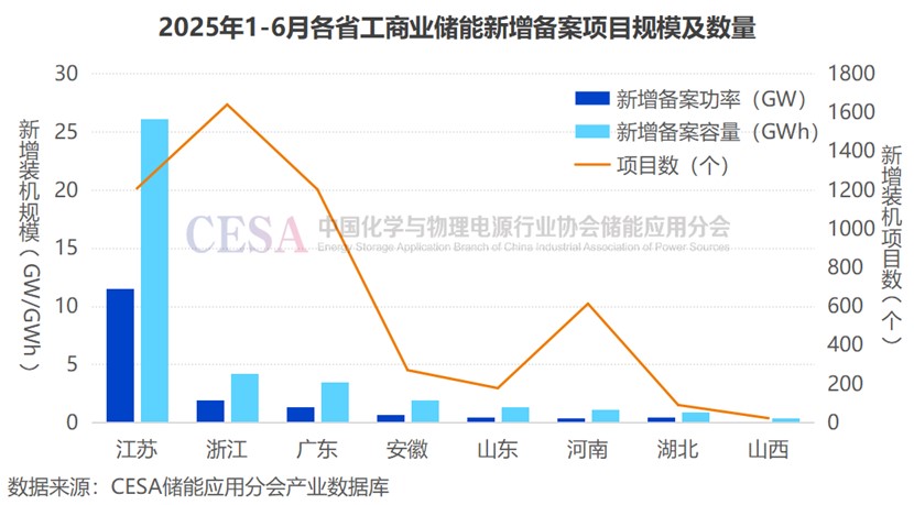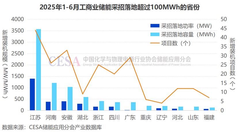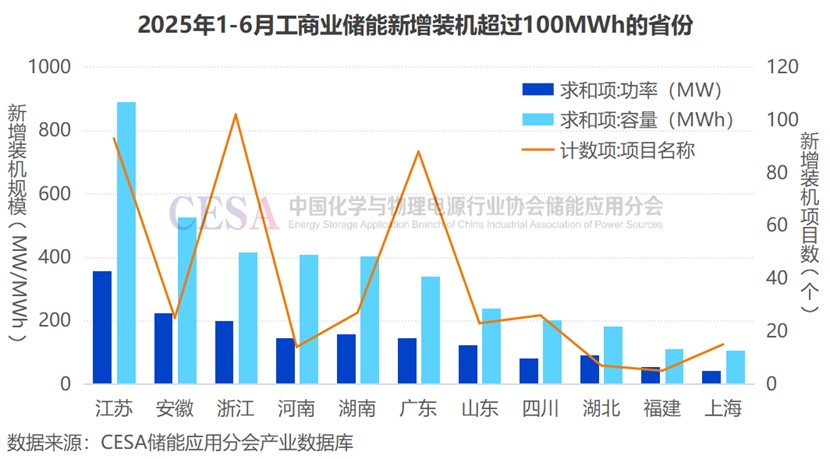 2025年1-6月,江蘇省工商儲新增裝機領跑全國,高達356.8MW/889.5MWh,容量占全國用戶側(cè)總新增裝機的21.6%。