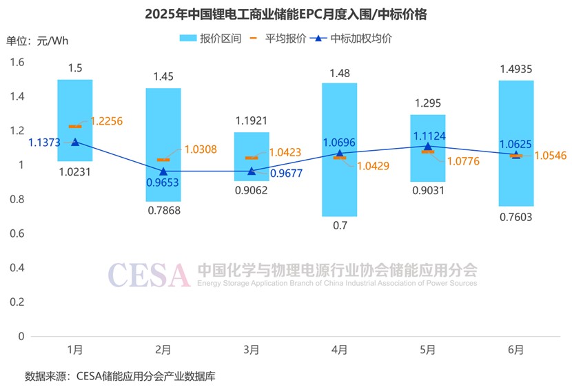 2025年上半年,工商業(yè)儲能采招落地項目中,超過6成項目采用EPC/PC等方式承建,鋰電工商儲項目總承包報價區(qū)間為0.7-1.5元/Wh,平均報價1.0763元/Wh,中標加權均價1.0612元/Wh。