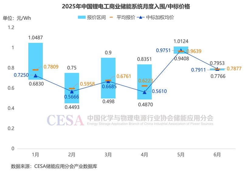 2025年上半年,鋰電工商業(yè)儲能系統(tǒng)入圍報價區(qū)間為0.4493-1.0487元/Wh,平均報價0.721元/Wh,中標加權均價0.7041元/Wh。