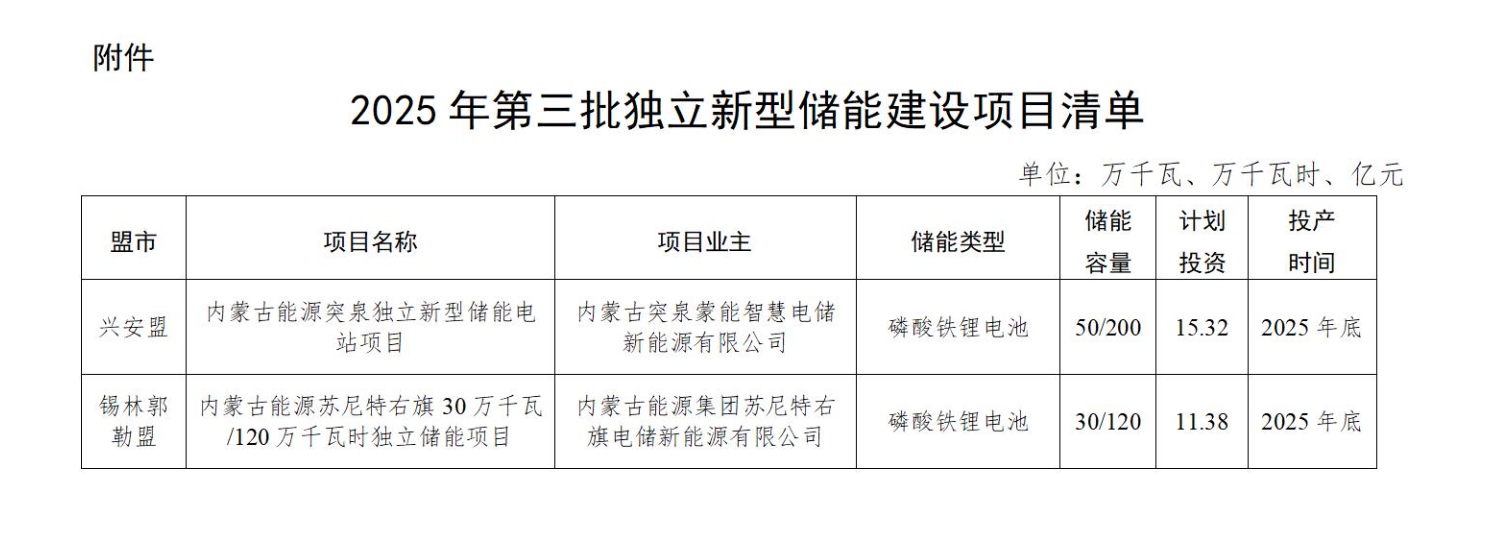 內(nèi)蒙古自治區(qū)能源局關(guān)于印發(fā)2025年第三批獨立新型儲能建設(shè)項目清單的通知