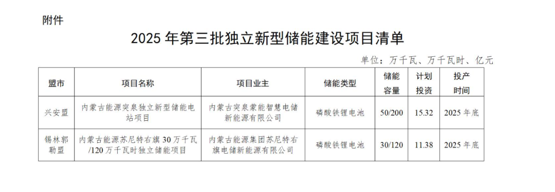 內蒙古自治區(qū)能源局關于印發(fā)2025年第三批獨立新型儲能建設項目清單的通知