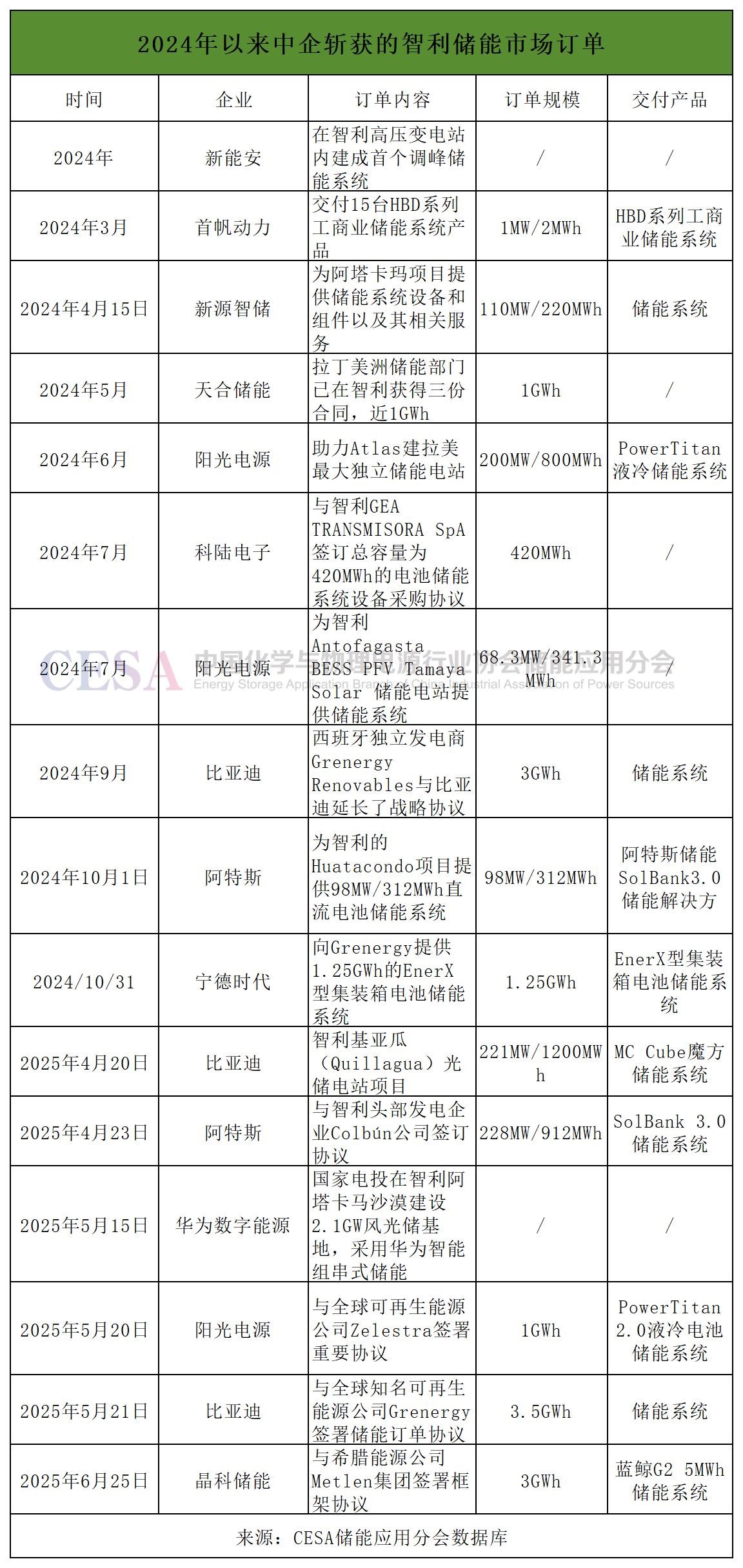 據(jù)CESA儲能應用分會數(shù)據(jù)庫不完全統(tǒng)計,2024年以來,包括寧德時代、比亞迪、天合儲能、華為、科陸電子、阿特斯等11家企業(yè)共在智利市場拿下16.96GWh儲能訂單,僅2025年上半年,中國在智利儲能市場就拿下了9.6GWh訂單,是美國市場的2.5倍。