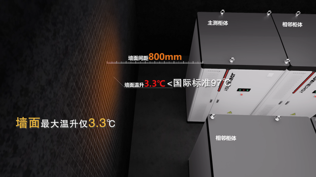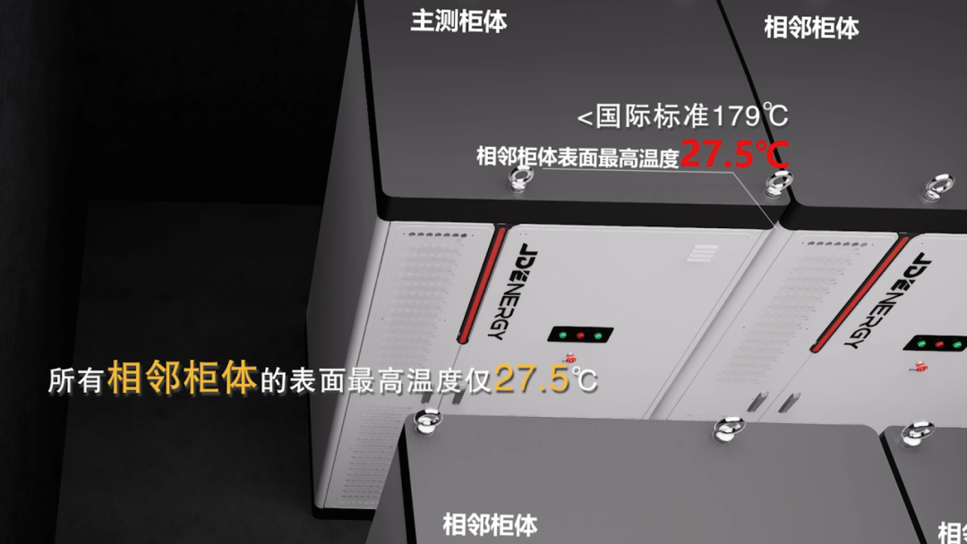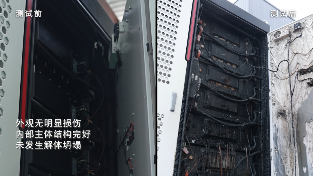 經(jīng)過48小時測試,主柜未起火、未爆炸,內(nèi)部主體結(jié)構(gòu)完好,無解體坍塌,外觀無明顯損傷;所有相鄰柜體的表面最高溫度僅27.5℃(遠(yuǎn)低于國際標(biāo)準(zhǔn)179℃),且外觀及內(nèi)部均完好如初,電池數(shù)據(jù)及BMS功能正常;墻面最大溫升僅3.3℃(遠(yuǎn)低于國際標(biāo)準(zhǔn)97℃)。