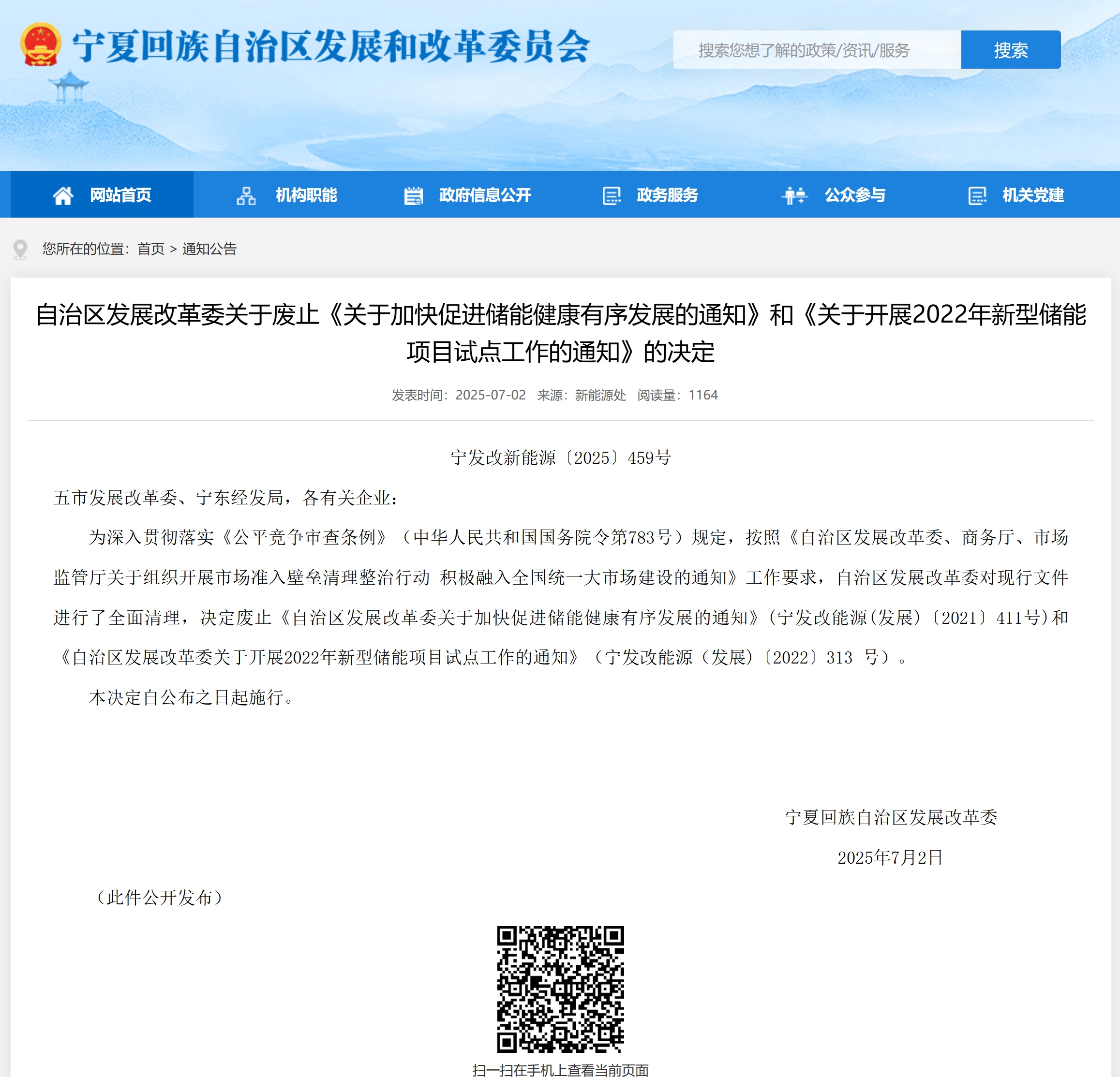 為深入貫徹落實(shí)《公平競爭審查條例》(中華人民共和國國務(wù)院令第783號)規(guī)定,按照《自治區(qū)發(fā)展改革委、商務(wù)廳、市場監(jiān)管廳關(guān)于組織開展市場準(zhǔn)入壁壘清理整治行動 積極融入全國統(tǒng)一大市場建設(shè)的通知》工作要求,自治區(qū)發(fā)展改革委對現(xiàn)行文件進(jìn)行了全面清理,決定廢止《自治區(qū)發(fā)展改革委關(guān)于加快促進(jìn)儲能健康有序發(fā)展的通知》(寧發(fā)改能源(發(fā)展)〔2021〕411號)和《自治區(qū)發(fā)展改革委關(guān)于開展2022年新型儲能項(xiàng)目試點(diǎn)工作的通知》(寧發(fā)改能源(發(fā)展)〔2022〕313 號)。
