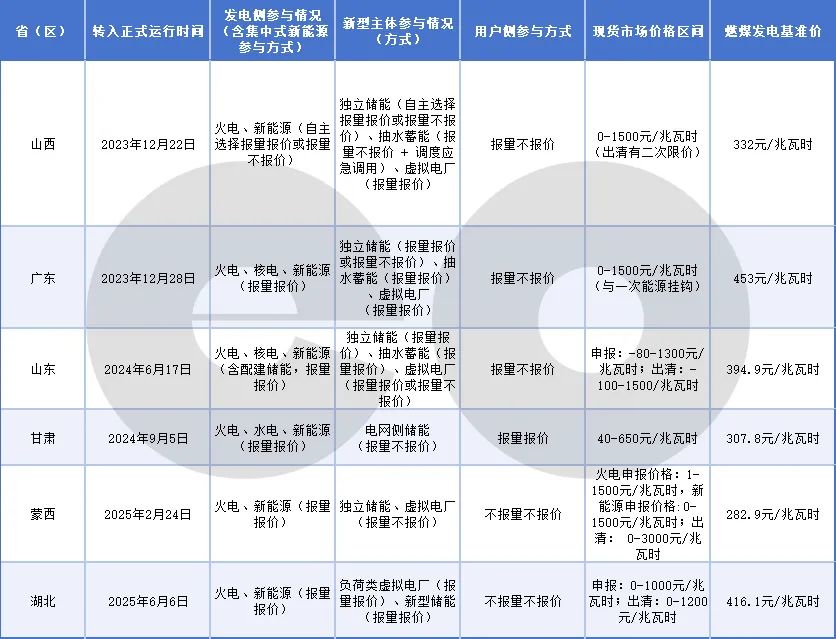 截至發(fā)稿,首批試點地區(qū)中的山西、廣東、山東、甘肅、蒙西和第二批試點地區(qū)中的湖北以及省間電力現(xiàn)貨市場已轉入正式運行。