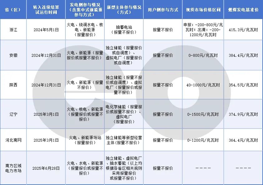 浙江、安徽、陜西、遼寧、河北南網(wǎng)等地和南方區(qū)域電力市場已轉入連續(xù)結算試運行。eo據(jù)公開資料梳理上述地區(qū)最新進展如下表: