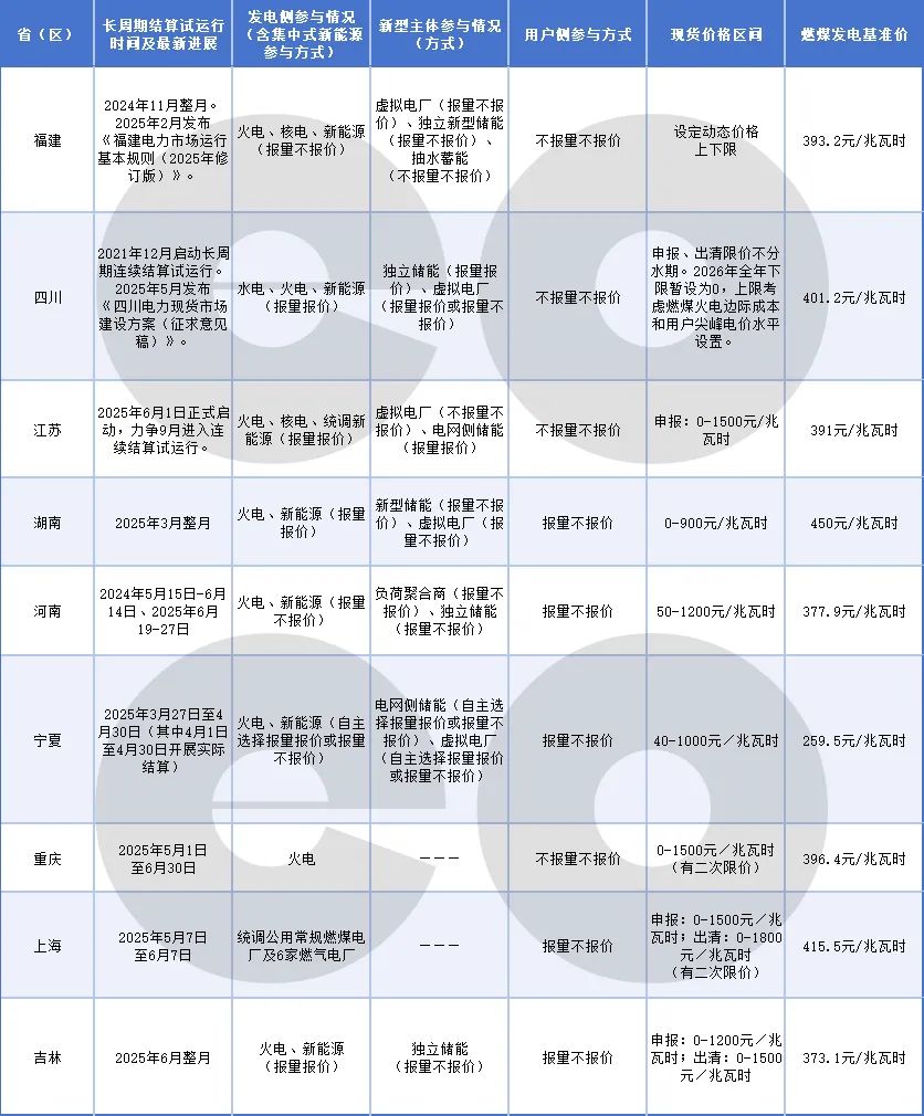福建、四川、江蘇、湖南、河南、寧夏、重慶、上海、吉林等地已開展過整月及以上長周期結算試運行。eo據(jù)公開資料梳理上述地區(qū)最新進展如下表: