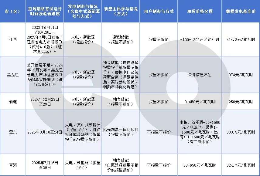 江西、黑龍江、新疆、蒙東、青海等地已開展過短周期結算試運行。eo據(jù)公開資料梳理上述地區(qū)最新進展如下表: